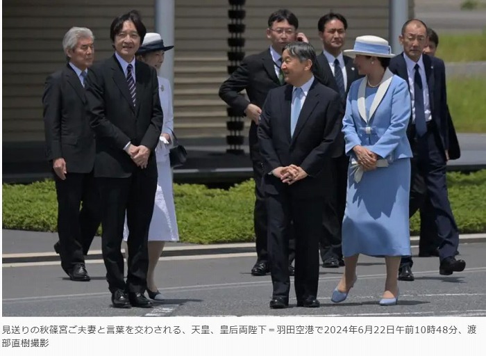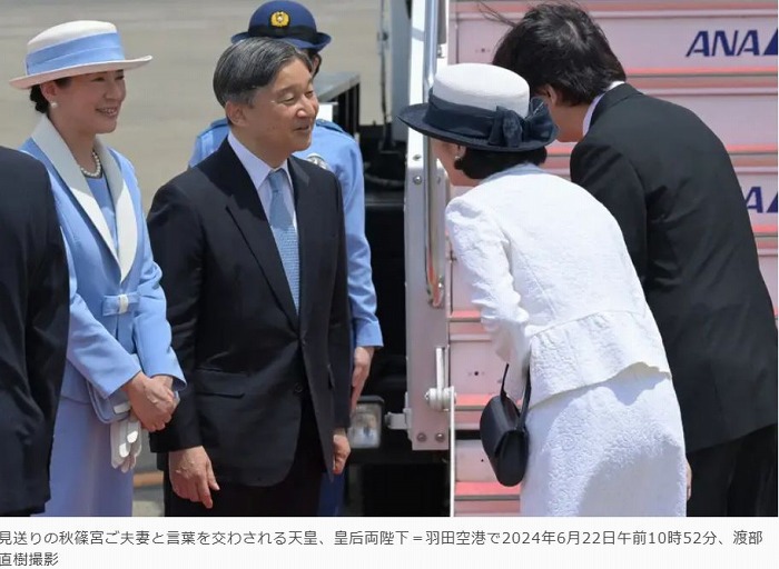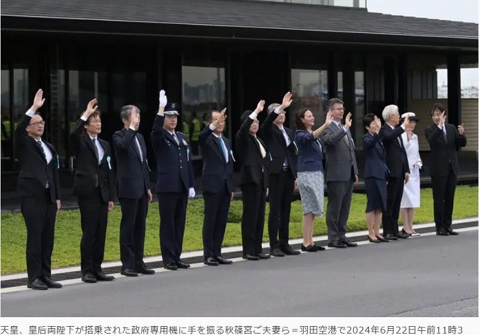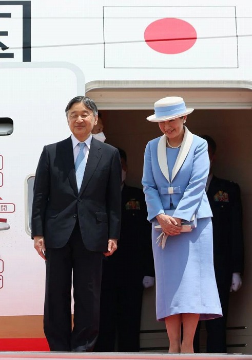 国際親善目的の外国訪問は即位後2度目。エリザベス女王の招待で2020年に訪英する予定だったが、コロナ禍で延期となり、22年に女王が亡くなり国葬に参列。今年に入り国王から改めて招待があった。羽田空港では秋篠宮ご夫妻や戸倉三郎最高裁長官夫妻らに見送られ、両陛下は一人一人にあいさつしてタラップを上がり、一礼して搭乗した。首席随員は中曽根弘文元外相が務め、皇后さまの主治医で精神科医の大野裕氏も随行した。