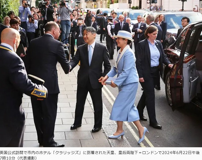【ロンドン時事】英国公式訪問のため政府専用機で日本を出発した天皇、皇后両陛下は22日夕(日本時間23日未明)、ロンドン郊外のスタンステッド空港に到着された。両陛下は空港で、チャールズ国王代理で侍従のブルックバラ子爵らの出迎えを受け、笑顔で握手を交わした。続いて国王から差し向けられた車でロンドン中心部のホテルに移動。出迎えた人々に手を振って応えた。