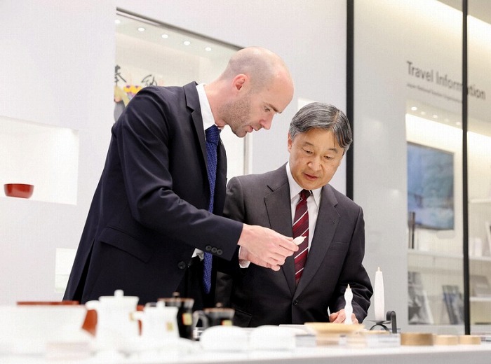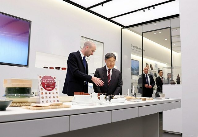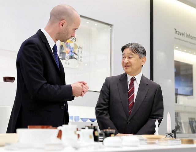 天皇陛下は23日午後、日本政府の情報発信拠点「ジャパン・ハウス ロンドン」を視察。同施設は、日本文化の魅力を発信する拠点として2018年に開設された。陛下は輪島塗のおわんなどの工芸品が置かれているショップを熱心に見学。続いて、縄文土器や祇園山笠、スポーツウエアなどの