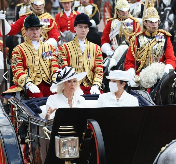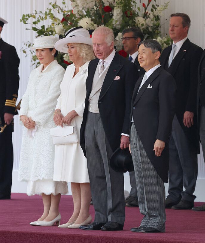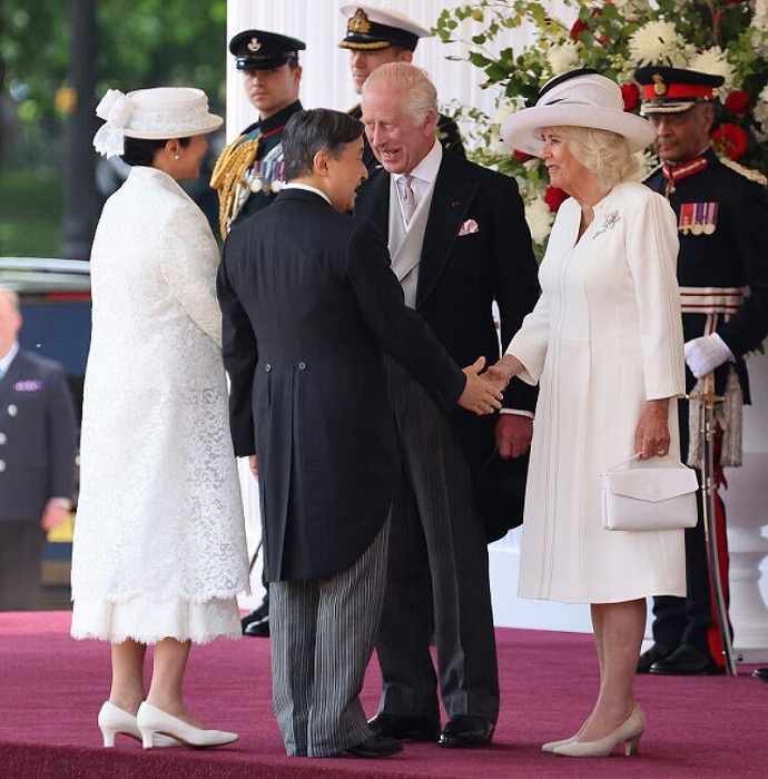 チャールズ国王と儀仗兵の前を歩いて栄誉礼を受けていましたが徳仁天皇は帽子を忘れたのかな?いや、あのシルクハットを忘れたのかなと。そして徳仁天皇はモタモタしているのでチャールズ国王にエスコート、誘導されることが多いですねぇ。 チャールズ国王は75才なのですがしっかりしています。カミラ王妃も76才で天皇皇后夫妻より一回りは年を取っているのにしっかりしていて、ホント天皇皇后夫妻がお子ちゃまに見えてしまうます。 晩餐会はどうなるのでしょうか。