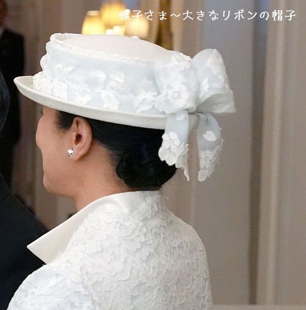 雅子さまですが、白い総レースのロングジャケットかコートの下に白いワンピースを着用したのでしょうか。襟がまた後ろが立っていて、前にブローチがついていました。帽子にはビックリしました。いつもの形の帽子でしたが、後ろに羽かと思ったらなんとーーリボンが着いているんです。