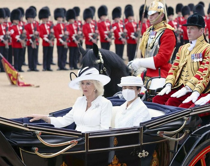 日本時間の午後8時ごろ、モーニング姿の陛下と純白の装いの皇后さまは、宿泊先のホテルを訪れたウィリアム皇太子と挨拶を交わし、歓迎式典が行われるホースガーズに向かわれました。両陛下はチャールズ国王夫妻と笑顔で再会を喜び、式典が始まると、両陛下を歓迎する礼砲が鳴り響きました。雲一つ無い青空のもと、儀仗(ぎじょう)隊の栄誉礼に続き、陛下は国王とともに儀仗隊を閲兵されました。続いて陛下は国王と、皇后さまはカミラ王妃とそれぞれ荘厳な馬車に乗り、バッキンガム宮殿までパレードされました。