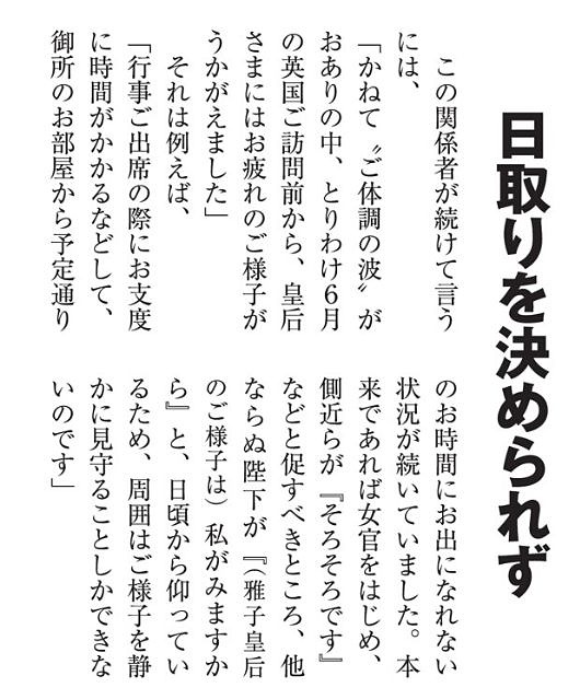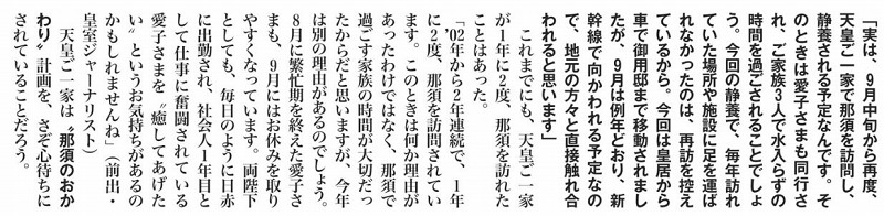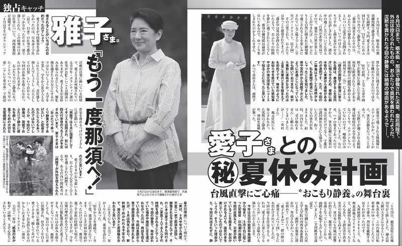 週刊現代の小さいコラムに書かれた事が最初で、その後から週刊新潮、女性セブンなどが後追いで記事にしていました。その後、週刊女性、女性自身が2回目の那須静養を書いています。2回目は愛子さまも同行されるとか。 9月は2回、3連休があるので、その気になれば9月14日から9月23日まで愛子さまが休暇を取り同行できます。