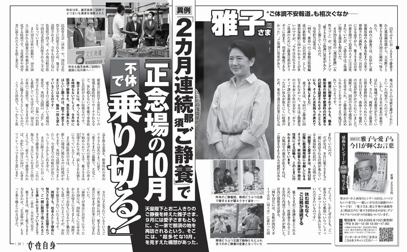 また10月は秋の叙勲や、10月30日に開かれる園遊会の準備が本格化する時期です。文化勲章や功労者に叙された人々を招く茶会や、園遊会に招待する賓客についての情報を徹底的にリサーチされるなど、休む暇もないご準備で身体的にも負担が大きい時期なのです。雅子さまには、ゆっくりされるお時間もないでしょう。9月中に那須で静養され、英気を養われてほしいと願うのは、陛下や愛子さまだけではなく、職員一同も望んでいることなのです」記事出典・全文は 女性自身 https://jisin.jp/koushitsu/2367208/
