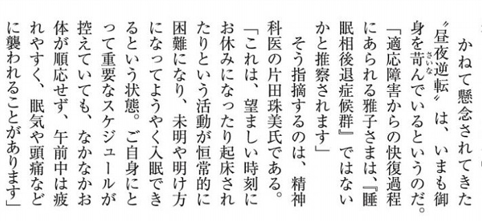 週刊新潮は「睡眠相後退症候群」と書いていましたが、なるほど雅子さまの状態と合うような病名でしたが、雅子さまは結婚当初から宵っ張りで、適応障害報道の後も昼夜逆転生活が続いている、などとよく週刊誌に書かれていたので、今に始まった事ではない症状です。