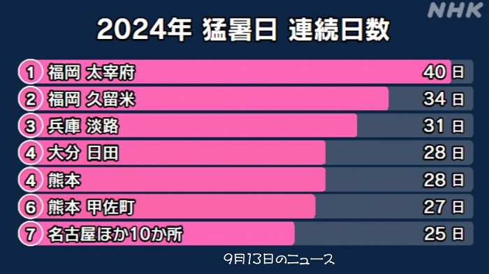 ところで日本って本当に縦に長いと思います。西日本の暑さの凄いこと。福岡県が35度以上の猛暑日連続60日になったとニュースで見ました。静岡市は9月20日に39.2度!!