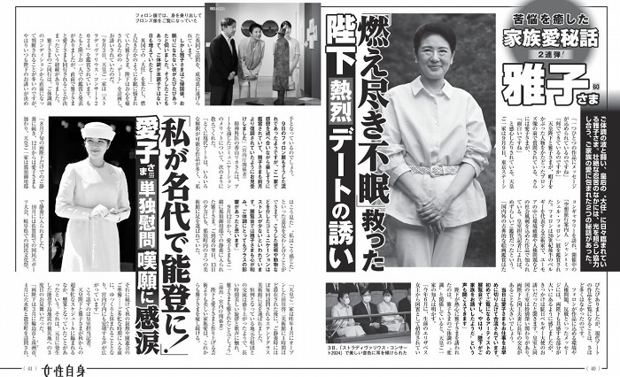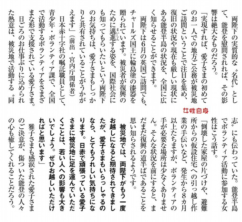 女性自身が「私が名代で能登に!」の記事が載っていたのでタイトルだけ見て中身の記事は真面目に読んでいませんでしたが、雅子さまがイギリス訪問後から燃え尽きたかのように不眠に悩まされ・・・と書かれていて、あれれ??私がブログに「雅子さまイギリス訪問後に燃え尽き症候群」と投稿したのを女性自身は真似したのか?と思ったりして(^^;)