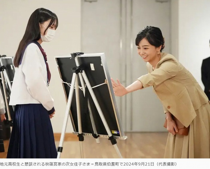 佳子内親王のご活躍は目を見張るものがありますね。「全国高校生手話パフォーマンス甲子園」と鳥取県はそのような関係性があったのですね。勉強になりました。到着時のベージュのお召し物は素敵ですし、皆さんとふれあう場ではベルトパーテーションもなく、手を伸ばせば届くようです。また高校生や説明者などの関係者との距離感も抜群です。ブルーのお召し物は何回も拝見しますが、私は好きです。ただ一つ、バッグを少しお考えいただきたいです。(好みもありますが、クラッチバッグ系の頻度が多い気がします。)開会式にご出席し鑑賞後その日のうちに東京に戻られたそうですね。