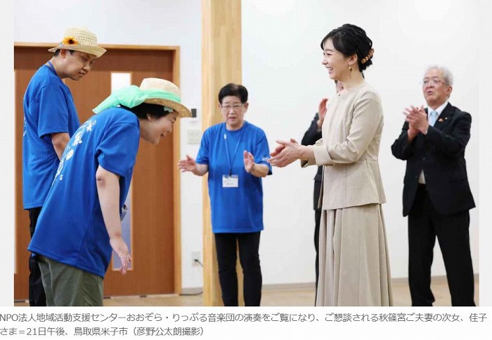 21日は同市の障害者支援を行っている施設などをご視察。知的障害者らで構成された「りっぷる音楽団」の歌唱やマラカスなどの演奏を鑑賞し、拍手を送られた。佳子さまは音楽団の団長、副団長に「皆さんの思いがとてもよく伝わってきました」と言葉をかけられた。その後、市内のホテルで手話パフォーマンス甲子園関係者の交流会に臨席し、高校生らと手話で懇談された。