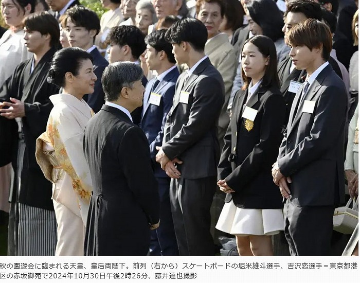 天皇、皇后両陛下が催される秋の園遊会が30日、赤坂御用地の赤坂御苑(東京都港区)で開かれ、柔道男子66キロ級の阿部一二三選手らパリ五輪・パラリンピックの金メダリストを含む各界の功労者ら約1400人が出席した。
