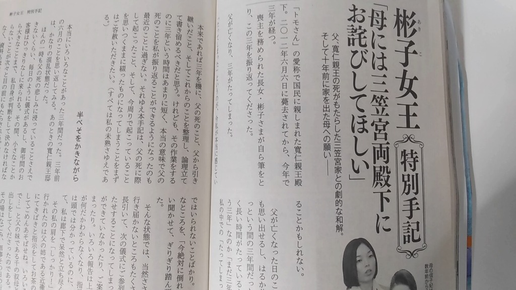 当時、信子さまと彬子さま、瑶子さま姉妹のゴタゴタは週刊文春で読みました。dマガジンに登録していなかったので買って読んだのだと思いますが、断捨離をした時に週刊誌は捨てたので今は読めないのが残念。かろうじて文藝春秋は捨てなかったようでしたが、それほど詳しく読まなかった記憶があります。今回もそれほどキッチリは読みませんでした。 この当時から彬子さま苦手が始まりました。
