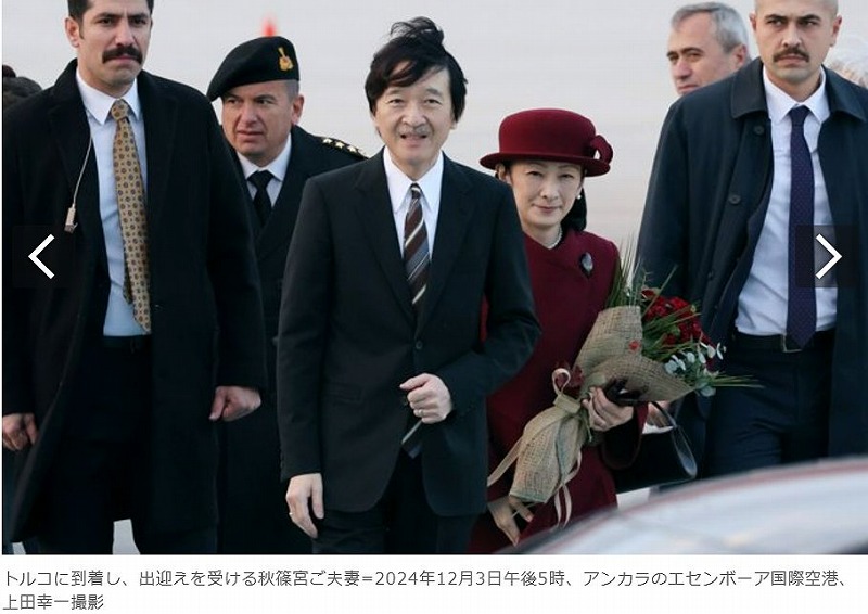 公式行事の前には、ご夫妻は宿泊先のホテルで日本とゆかりのあるトルコ人らとご懇談。東日本大震災で、同国の緊急援助隊の隊長を務めた男性に感謝の気持ちを伝えるとともに、昨年2月のトルコでの地震についてお見舞いを伝えられた。5日は政府専用機でイスタンブールへ移動し、外交関係樹立100周年記念式典に臨席される記事出典 産経新聞 https://www.sankei.com/article/20241205-PT2XNHMVEROZ3ANPOMDQUDAVIY/