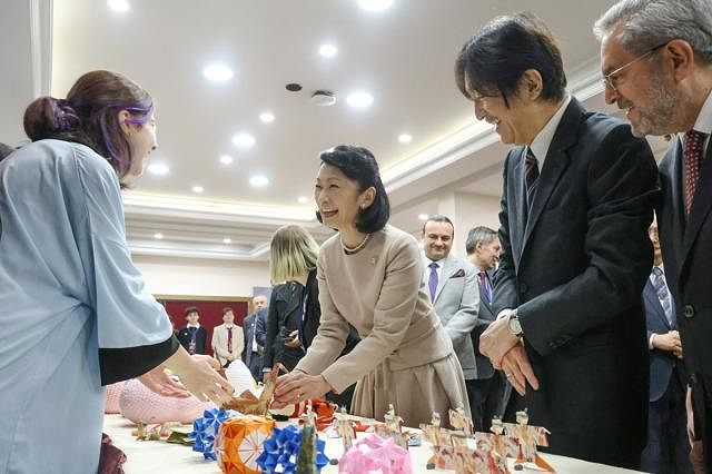 学生による日本語のスピーチや「上を向いて歩こう」の合唱、ソーラン節などをご鑑賞。ご夫妻は書道や折り紙などの作品も手に取ってご覧になり、秋篠宮妃紀子さまは手芸作品について、「毛糸は何を使っていますか」と尋ねられた。(産経新聞)