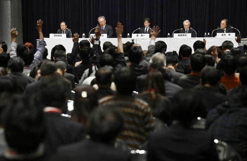 記者が立っていて随分とシツコク聞いていましたが、返答に困り膠着状態になっていました。この頃から興味をそそられて真面目に見たのですが、4時開始からもう5時間以上経っていて平均年齢70才の高齢になっている出席者には疲労の色が見えていたのでそのうち倒れる人が出るのでは?と心配になりました。