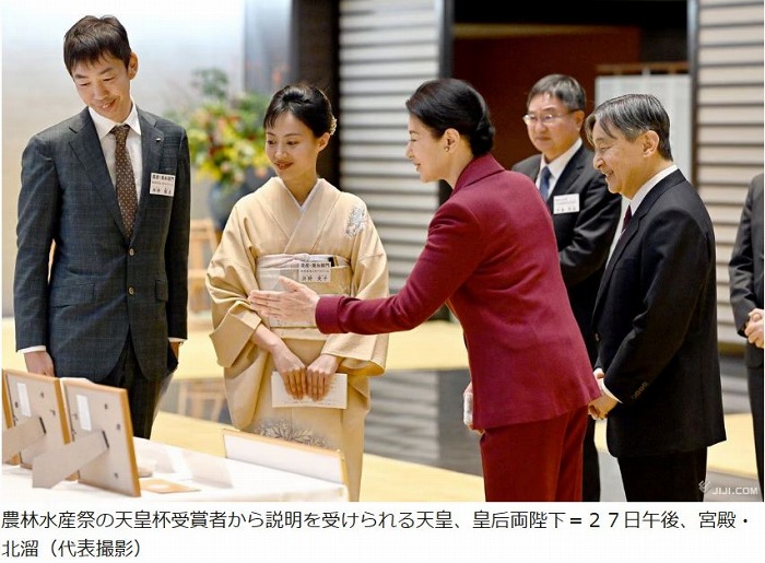 天皇、皇后両陛下は27日、皇居・宮殿で、農業や畜産業、水産業などの分野で優れた業績を上げた農林水産祭の天皇杯受賞者と面会された。天皇陛下は「心からお祝いします。農林水産業に携わる人々の励みになると思います」とねぎらった。面会したのは7組14人で、両陛下は取り組みを紹介するパネルや生産品を見ながら、説明を聞いた。島根県安来市の「えーひだカンパニー」代表の川上義則さんは、農業などを通じた地域づくりについて話し、陛下は「地域にいろいろと貢献されていますね」と述べた。長野県松川町でリンゴを生産する「なかひら農場」代表の中平義則さんには「温暖化の影響はありますか」と尋ねた。記事出典 時事通信 https://www.47news.jp/12084105.html