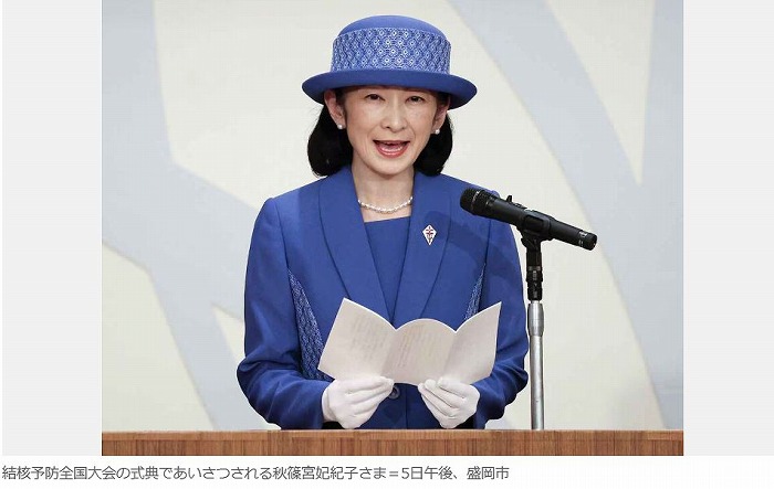 秋篠宮妃紀子さまは5日、盛岡市のホテルを訪れ、第76回結核予防全国大会の式典に臨席された。結核予防会の総裁を務める紀子さまは、「世界の人々が結核を患い、苦しむことのないように、私たちを含め世界の結核対策の関係者が今後も経験を共有し力を合わせていくことが重要です」とあいさつされた。
