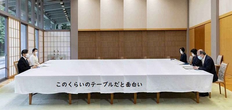 対面するのがテレビのモニターでも大きなテーブルを使用する天皇皇后夫妻なので、この際、もっと大きなテーブルを使用して欲しいものです。12畳くらいのテーブルで懇談する人2名とか、面白くなければ天皇家じゃない(^^)