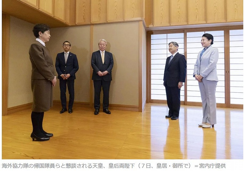 天皇、皇后両陛下は7日、皇居・御所で、帰国した海外協力隊員ら男女8人と懇談された。宮内庁によると、懇談は約1時間で、両陛下は「有益な活動をされていますね」と隊員をねぎらわれた。ソフトボール経験がある皇后さまは、アルゼンチンで野球を指導した男性に「私はショートをやっていました」と話されたという。記事・画像出典 読売新聞https://www.yomiuri.co.jp/koushitsu/20250307-OYT1T50210/
