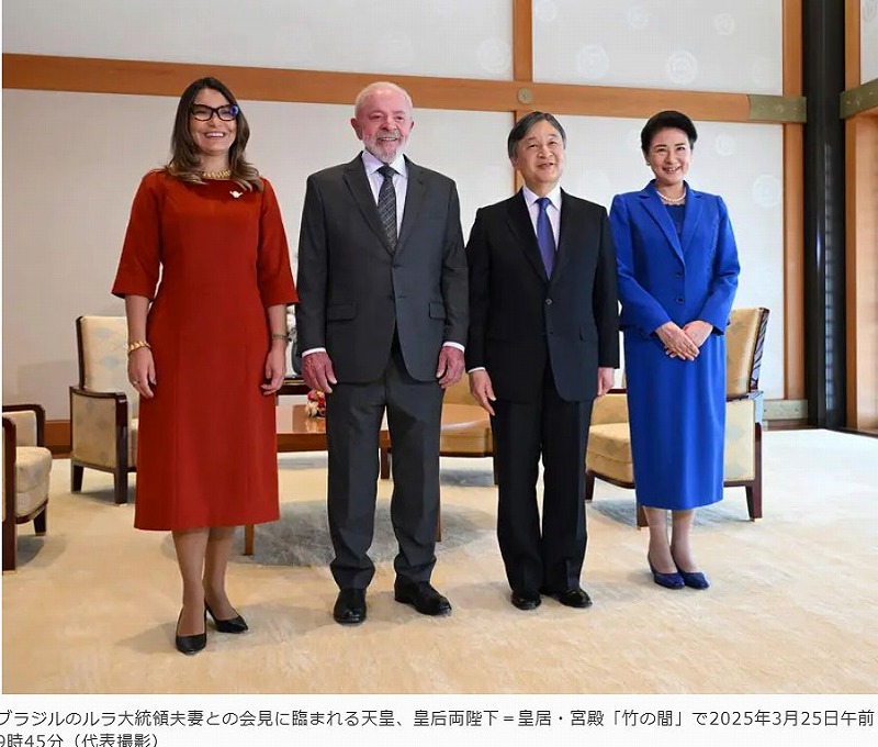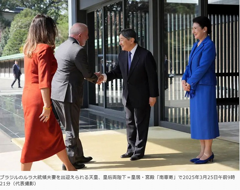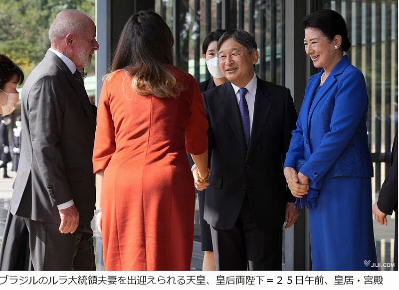 国賓として来日したブラジルのルラ大統領夫妻の歓迎行事が25日午前、皇居・宮殿東庭であった。天皇、皇后両陛下は宮殿の車寄せで、大統領夫妻を笑顔で出迎えられた。国賓の来日は2019年5月の1期目のトランプ米大統領夫妻以来。新型コロナウイルス感染症の影響で6年ぶりとなった。