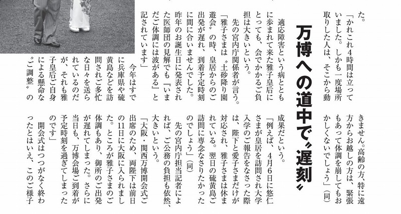 とかく週刊誌は「責任感が強過ぎる雅子さま、完璧主義者の雅子さま」と褒め称えるのですが、責任感が強く完璧主義なら、遅刻が常習は無いでしょ!!と強く言いたいです。