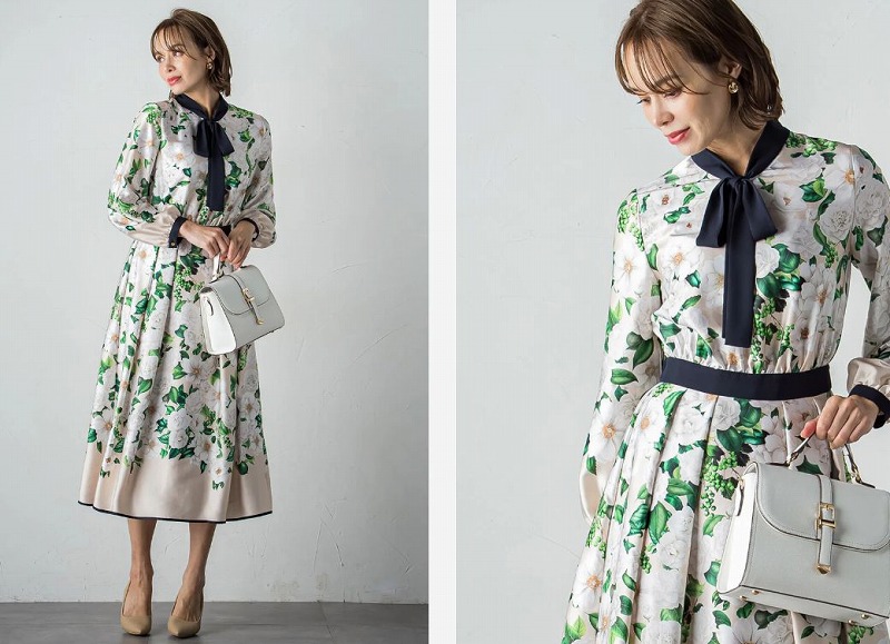 淡いクリーム地がベースのカメリアプリントのワンピース。