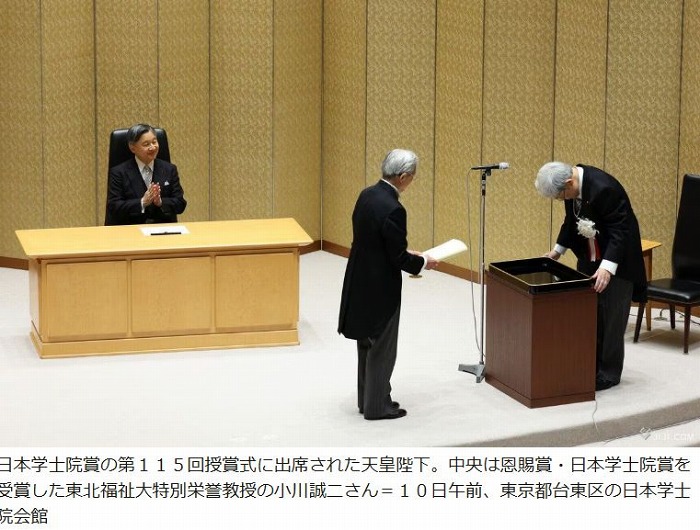 天皇陛下は10日、東京・上野の日本学士院会館で開かれた日本学士院賞の第115回授賞式に出席された。受賞者は9人で、脳の活動を測定できる機能的磁気共鳴画像法(fMRI)を開発した東北福祉大特別栄誉教授の小川誠二さん(91)には併せて恩賜賞も贈られた。