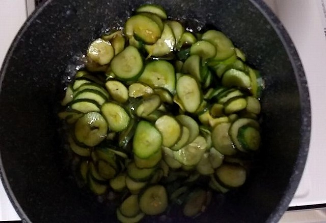 キュウリ1Kgで作っている最中の画像でボケています。出来上がり冷めたらタッパーに入れ冷蔵庫で保管です。