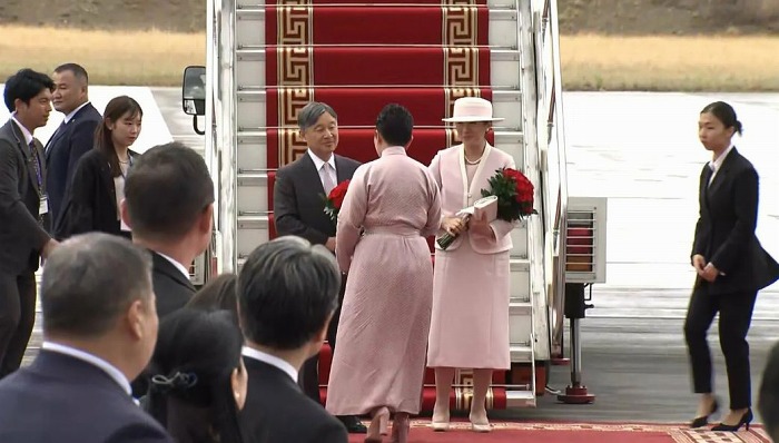 両陛下は羽田空港で、秋篠宮ご夫妻らの見送りを受け出発し、約5時間かけチンギスハン空港に到着。専用機のタラップを降りると、民族衣装を着た女性から銀杯に入った乳製品「アーロール」を