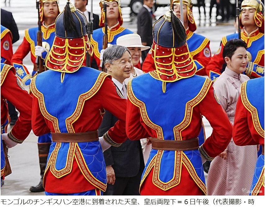 【ウランバートル時事】天皇、皇后両陛下は6日、国賓としてモンゴルを公式訪問するため、東京・羽田空港を政府専用機で出発し、首都ウランバートルに到着された。同国訪問は、天皇陛下は皇太子時代の2007年以来で、歴代天皇、皇后としては初めて。13日に帰国する。