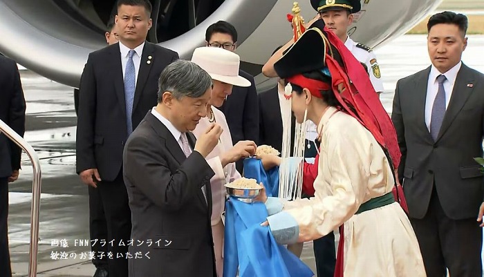 フライト約5時間で無事にモンゴルに到着された天皇皇后夫妻に相応しく、モンゴルではタラップを降りると直ぐにモンゴルのお菓子で歓迎でした。モグモグしながら挨拶だったみたいです。
