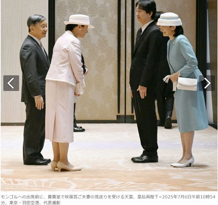 7月6日天皇皇后夫妻は羽田空港から政府専用機でモンゴルへ向けて出発されました。東京地方は今日も暑く”通常見送りは乗り込みのタラップの前で行われますが、6日は暑さのため、雨の日の対応と同様に羽田空港の貴賓室で見送りが行われました”とのことでした。
