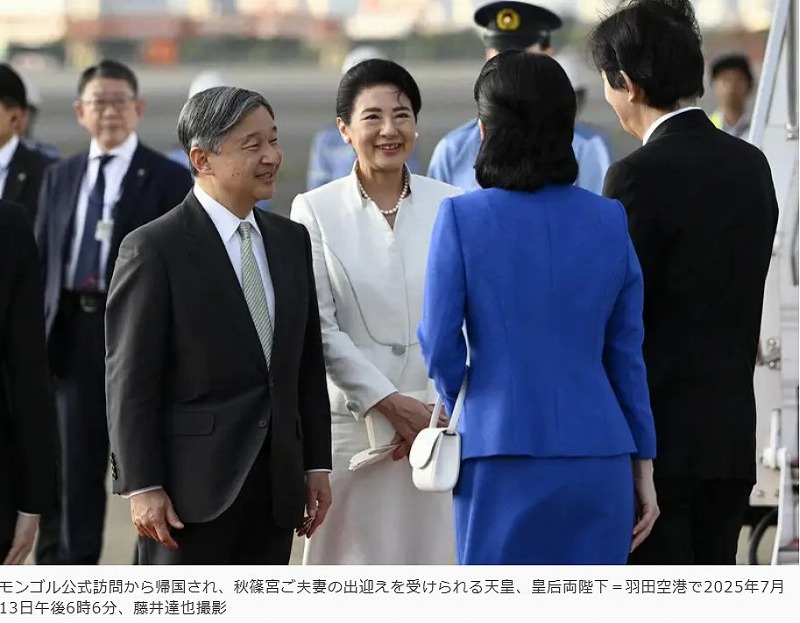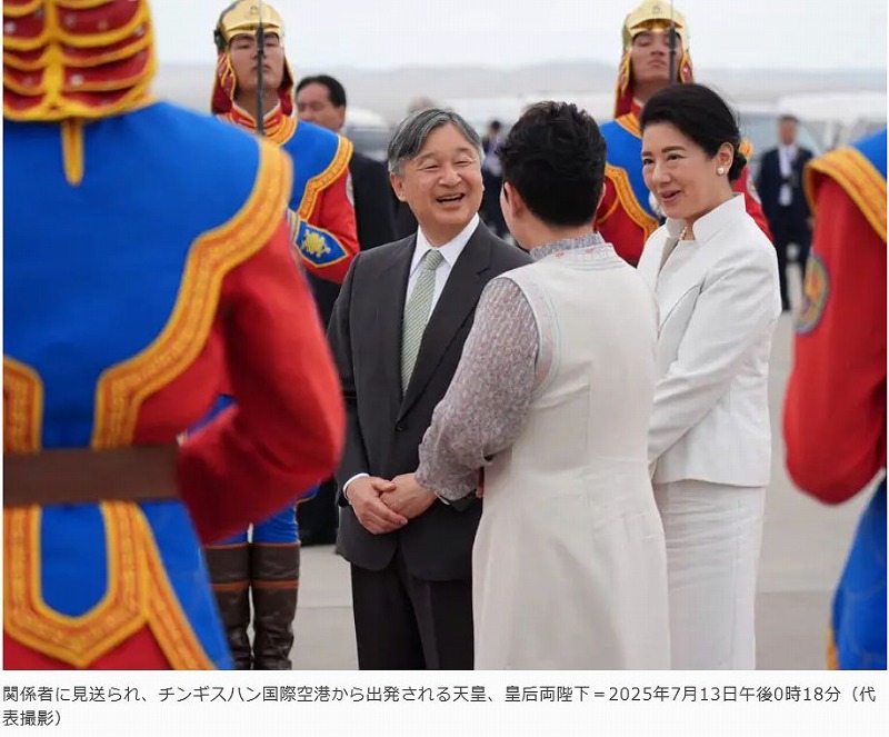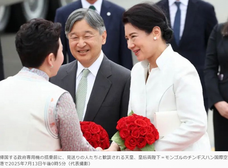 両陛下はモンゴル訪問を終え、「初めて二人でモンゴルを訪れ、とても思い出深い訪問となりました。日本とモンゴルの友好親善と協力関係がより一層進展することを心から願っています」などとする感想を宮内庁を通じて発表した。記事出典 時事通信 https://www.jiji.com/jc/article?k=2025071300155&g=ryl