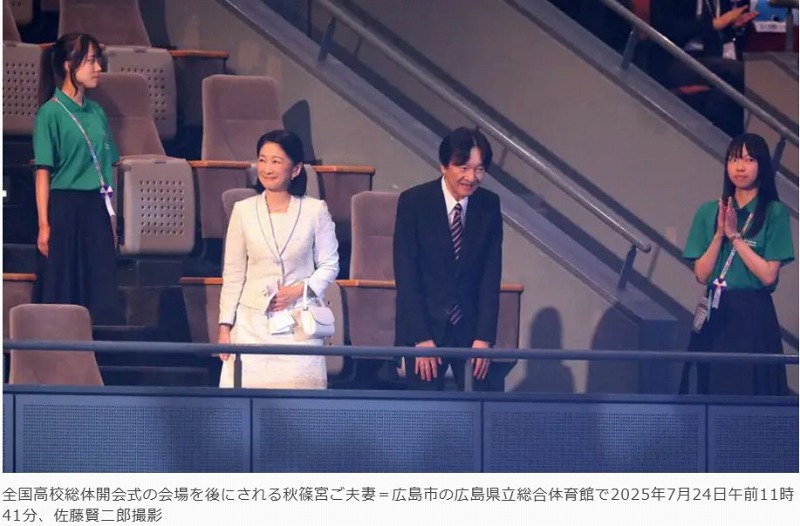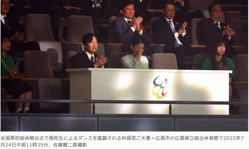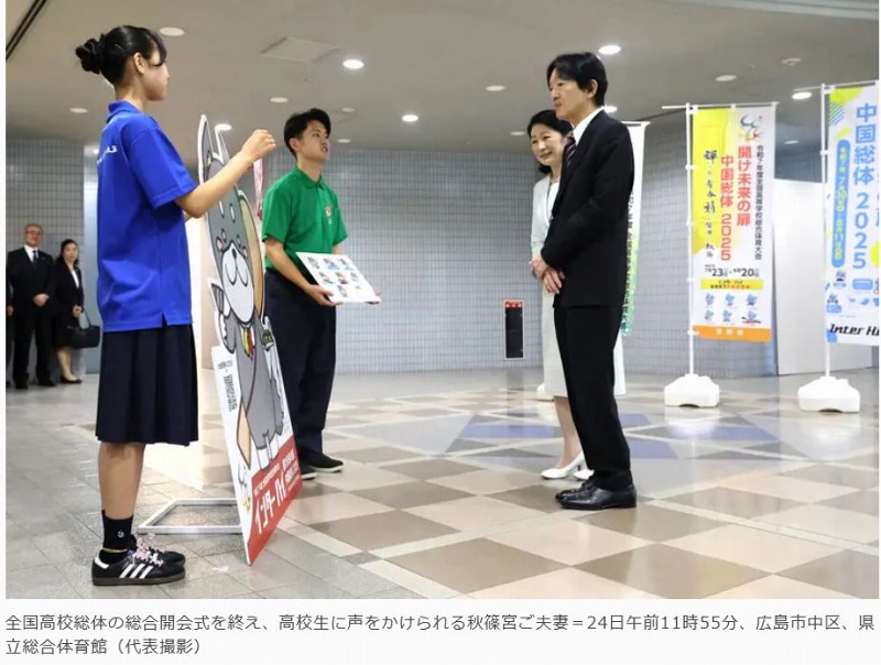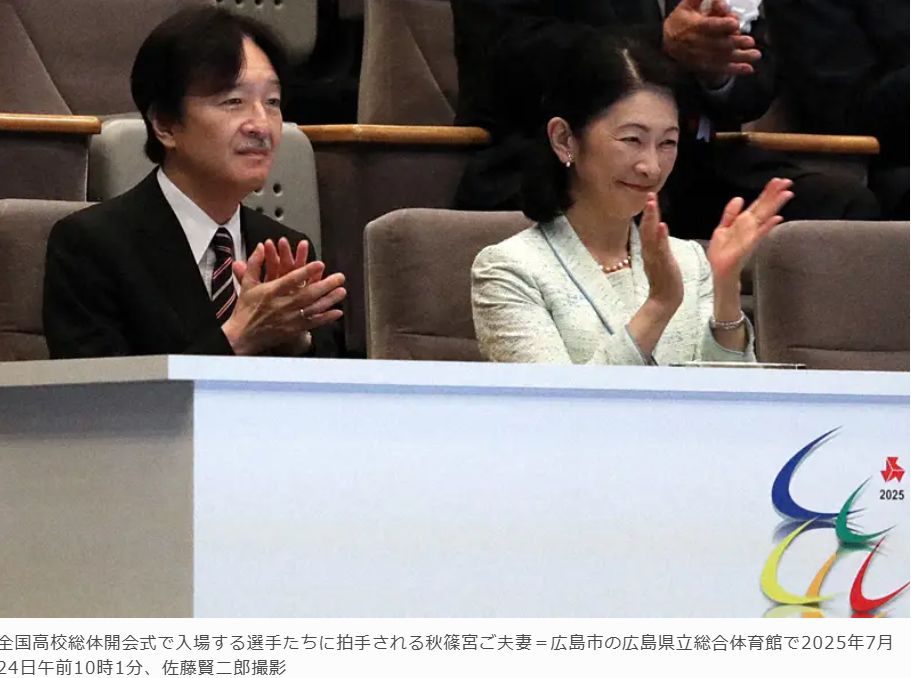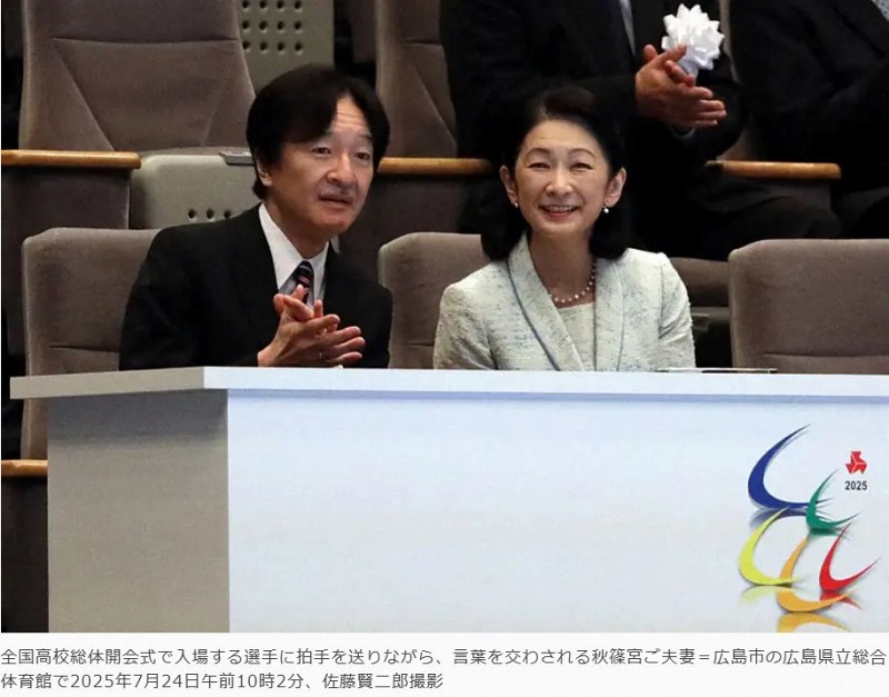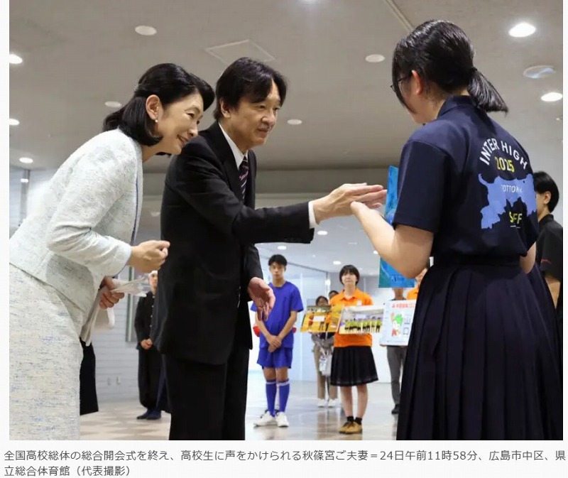 秋篠宮ご夫妻は24日、広島県立総合体育館(広島市)で開かれた全国高校総合体育大会(インターハイ)の総合開会式に出席された。秋篠宮さまは式典で戦後80年に触れ、「被爆地広島を幹事県として、ここに集う人々が、未来に向けて平和への思いを新たにする機会を得ることは、非常に意義深い」とあいさつ。「日頃の成果を大いに発揮されることを期待しております」とも話した。
