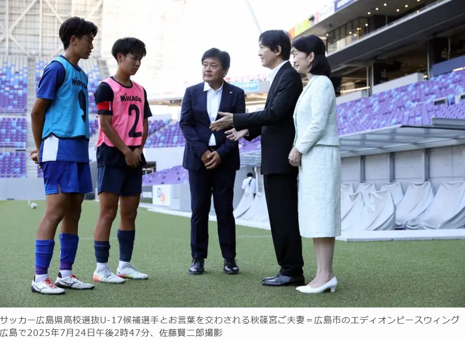 ご夫妻は続いて、式典で和太鼓などの演出に携わった高校生と交流。2024年に開業した広島サッカースタジアム(同市)も視察した。 ご夫妻は23日から1泊2日の日程で同県を訪れた。