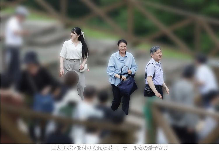 愛子さまの頭に巨大リボンのタイトルが笑わせますねぇ。実は私も50才過ぎまで、愛子さまくらいの超ロングヘアーをしていた時期があります。愛子さまは若いのに意外と毛量が少ないようなので、ここまでの超ロングヘアーでもあまり重量を感じないのかもしれません。ただリボンよりリボンの形をしたバレッタの方が年相応で良かったのに。雅子さまはいっそのことショートにしたら良いのにね。