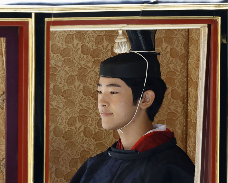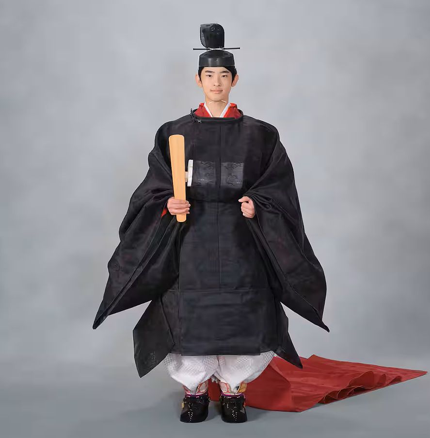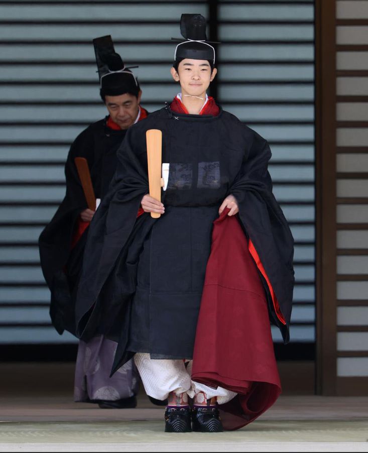 今日、成年式を終えた悠仁さまは最初にモーニング姿で皇居に向かいました。加冠の儀では未成年の「ハレの場」の装束として受け継がれた浅黄色の袍、「闕腋袍(けってきのほう)」姿で臨み、「空頂黒※(※巾ヘンに責)(くうちょうこくさく)」その後、成年の文官用の黒の装束「縫腋袍(ほうえきのほう)」に着替え、垂纓の付いた冠を着けて宮中三殿を参拝。(装束の名前は難しいです)