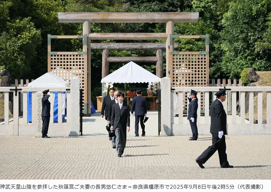 午後は奈良県橿原市へ移動し、神武天皇陵を参拝して玉串をささげ、拝礼された。宮内庁によると、神武天皇陵へのお一方でのご参拝は初めて。
