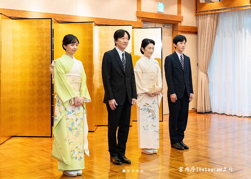 明治記念館での昼食会も素敵でした。特別な階級の方々のお食事会ではなく、庶民に近い目線を感じました。秋篠宮家の女性がお着物で招待客は洋装が多かったですが、きっと秋篠宮ご家族のお心遣いがあったものと思いました。ご家族の並び方もご両親を中心に、お立場を考えていらっしゃる、決して人前を移動しない、出しゃばりません。一連の行事の最初から最後まで悠仁親王の所作の美しさは、眼福の域を超えました。とても勉強されたことでしょう。グラスの持ち方が最高!ついつい先日の晩餐会初の人のグラスの持ち方とズズズ飲みを思い出してしまいました(笑)テーブルのお花も素敵。色合いもきれいでした。