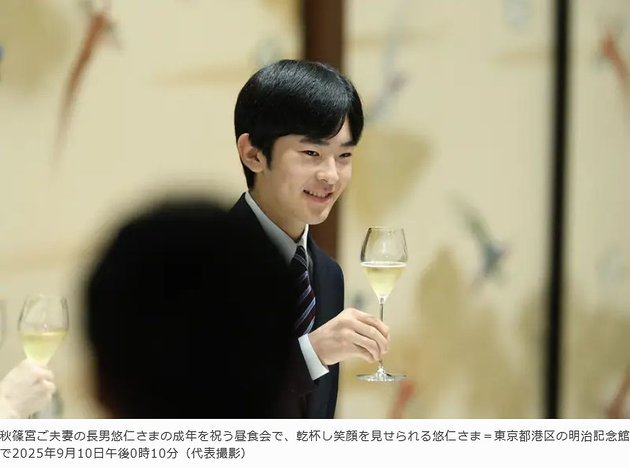 乾杯では、悠仁さまもノンアルコールの炭酸飲料が注がれたグラスをにこやかに掲げられた。宴席には石破首相ら三権の長、宮内庁幹部、悠仁さまが在籍する筑波大の永田恭介学長らが招かれ、悠仁さまは「ありがとうございます」と謝意を伝えられたという。