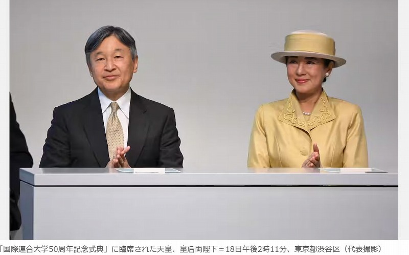 天皇、皇后両陛下は18日、東京都渋谷区の国際連合大学を訪れ、同大の50周年記念式典に臨席された。天皇陛下は英語でお言葉を述べ、経済格差や気候変動といった諸問題の解決に向けた同大の取り組みに敬意を表された。また、「安心で公正かつ持続可能な未来を切り拓(ひら)くべく、世界を変革する知識の創出を重ねていかれること」を願われた。同大の大学院生らとの懇談の場では、両陛下は研究内容などについて、英語で言葉を交わされた。記事出典 産経新聞 https://www.sankei.com/article/20250918-XYSOI5CMYVJFXL4LNAMITWV4O4/