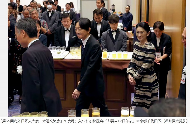 秋篠宮ご夫妻は17日、東京都千代田区のホールを訪れ、「第65回海外日系人大会」の参加者歓迎交流会に臨席された。同大会は世界各地の日系人が集い、日系社会の課題や方向性を考えるため昭和32年から開催。ご夫妻はこれまでも、たびたび大会の行事に臨まれている。