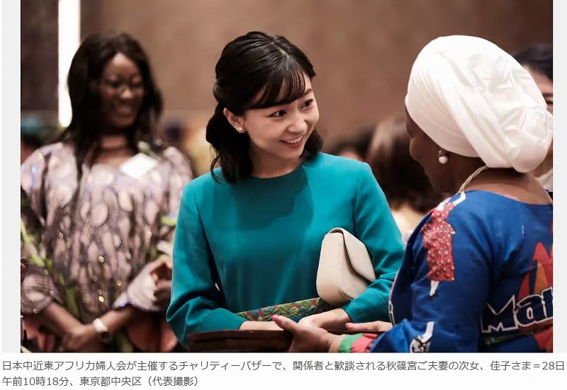 秋篠宮ご夫妻の次女、佳子さまは28日、東京・日本橋のホテルで、日本中近東アフリカ婦人会主催の第22回チャリティーバザーを視察された。