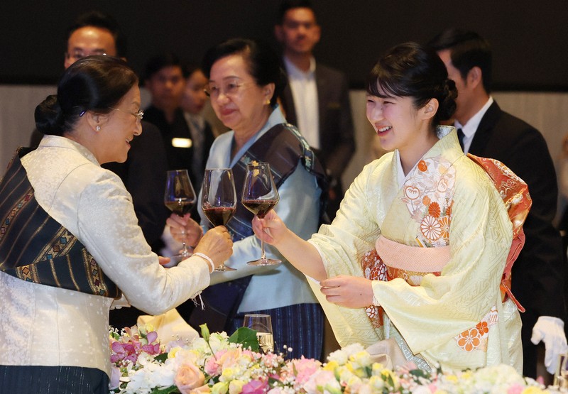 ラオスを訪問中の天皇、皇后両陛下の長女、敬宮(としのみや)愛子さまは18日夜、首都ビエンチャンで、パーニー国家副主席主催の晩餐会に臨席し、「日本・ラオス両国において、お互いの国への理解や関心がより一層高まり、果てしなく続く悠久のメコン川の流れのように、どこまでも発展していくよう願っています」などとお言葉を述べられた。