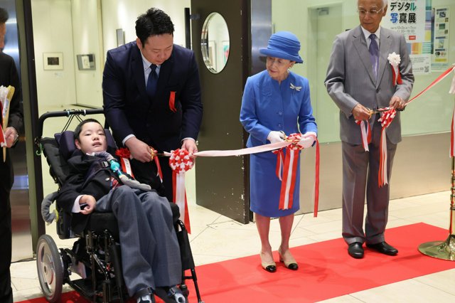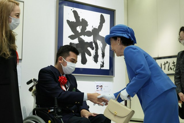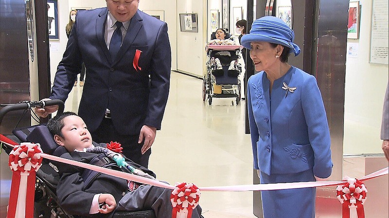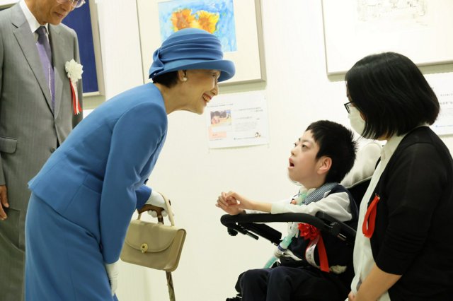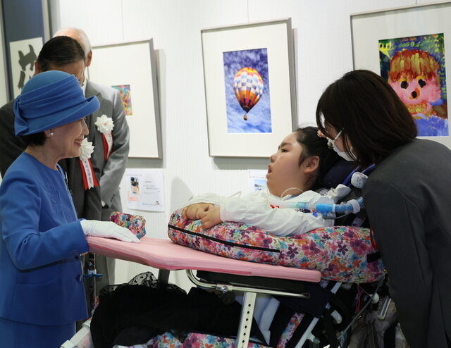 今回は絵画や書など122点を展示。華子さまはテープカットの後、作品を見て回り、受賞者と交流した。絵画作品で全国肢体不自由特別支援学校PTA連合会賞を受賞した永田悠人(はるひと)さん(9)には「おめでとうございます」とねぎらい「作品を増やしていってね」と声をかけた。同展には常陸宮さまが第1回から足を運び、第5回、第10回などの節目の年には華子さまとご夫妻で訪れていた。