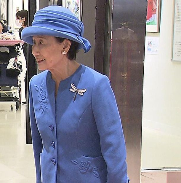 スーツのジャケットの左右には型押しでしょうか、それとも刺繍でしょうか、薔薇が入っています。テーラードカラーではない襟元は85才の年齢を感じさせない若々しく見えました。そしてなんと~トンボのブローチを付けているんです。かなり大き目のトンボのブローチです。トンボ=悠仁さまを連想しますが秋篠宮家以外の皇族でトンボのブローチを付けてくれる皇族がいることが嬉しいです。パールのネックレスも付けていないのでブローチの存在感のあること(^^)