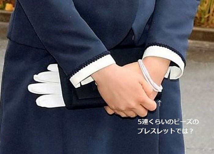 愛子さまの左手首に見えるのはおそらく5連くらいのビーズのブレスレットではないかと思われます。お守りに白いハンカチを持つよりこのブレスレットの方が良いです。