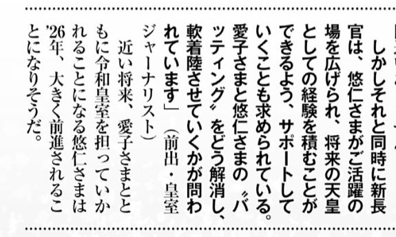 タイトル「雅子さまの懊悩 愛子を端に追いやって」私は性格が悪いので、「愛子を端に追いやがって」に見えてしまったのですが、それを言うなら「悠仁さまを端に追いやがって~!!」と言いたいです。