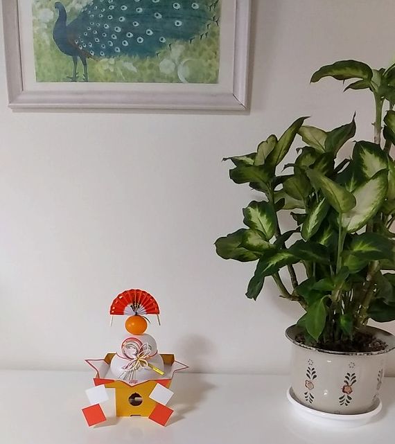 鏡餅小さめで可愛いです。サイドボードの上も植木と絵画風のカレンダーの絵の額縁。