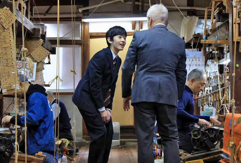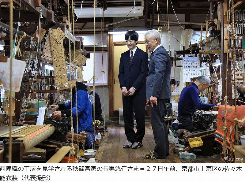 京都市を訪問中の秋篠宮家の長男悠仁さま(19)=筑波大1年=は27日、能装束などに使われる西陣織の織元「佐々木能衣装」(上京区)を見学された。