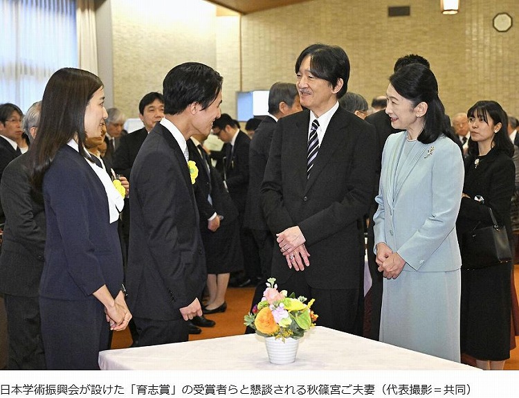 秋篠宮ご夫妻は3日、東京・上野の日本学士院会館を訪れ、若手研究者を支援するため日本学術振興会が設けた「育志賞」の授賞式に出席された。大学院博士課程の学生を対象にした賞で、20~30代の19人が選ばれた。長崎大大学院でニホンウナギの稚魚の行動について研究した長谷川悠波さんが代表し「未解明な物事に挑戦することの楽しさや新たな現象を発見する興奮を次の世代につなげられるよう、まい進する」とあいさつし、ご夫妻は拍手を送った。式後、受賞者と笑顔で懇談した。育志賞は、厳しい経済環境の中で勉学に励む若手研究者を支援する資金として、上皇さまが日本学術振興会に下賜金を贈ったことを機に2010年度に創設された。記事出典 共同通信